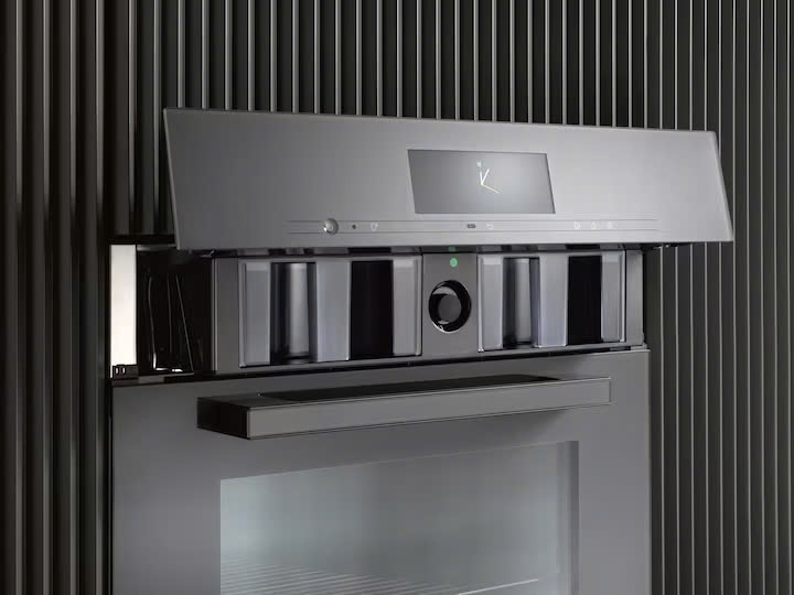 Kết hợp thiết kế và tính dễ sử dụng: bảng điều khiển có thể mở và đóng nhẹ nhàng chỉ bằng một cú chạm ngón tay - mà không cần mở cửa buồng nấu. Bình chứa nước, bình chứa nước ngưng tụ và nhiệt kế thực phẩm không dây được giấu phía sau tấm nâng. Để có cái nhìn tốt nhất về màn hình, bảng điều khiển sẽ hơi nghiêng về phía bạn khi bạn nhấn nút.