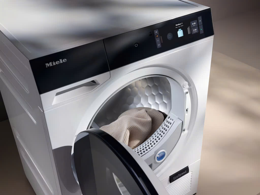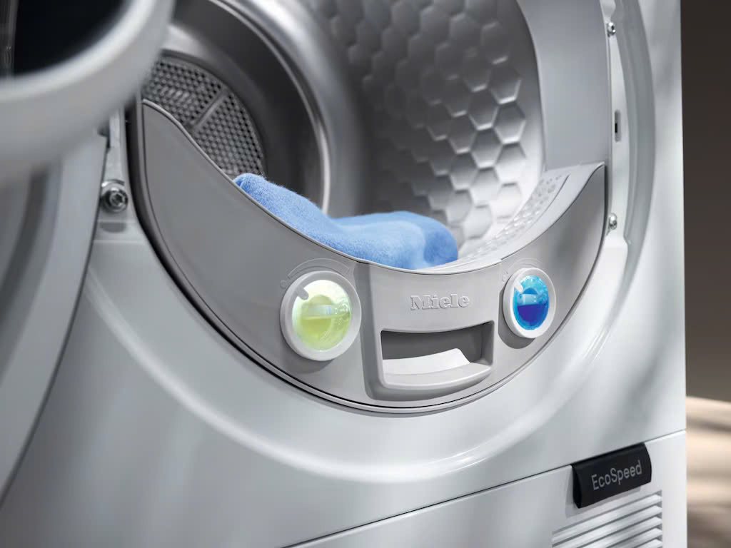 Máy sấy quần áo của chúng tôi với công nghệ EcoDry sấy khô nhanh chóng một mẻ quần áo đầy với mức tiêu thụ năng lượng tối thiểu. Hơn nữa, hệ thống lọc được cấp bằng sáng chế của chúng tôi (bằng sáng chế EP 2 455 537) ngăn không cho xơ vải làm tắc bộ trao đổi nhiệt. Nhờ sự kết hợp này mà máy sấy quần áo Miele có thể duy trì hiệu suất trong suốt thời gian sử dụng và mang lại thời gian chạy ngắn đáng kinh ngạc.