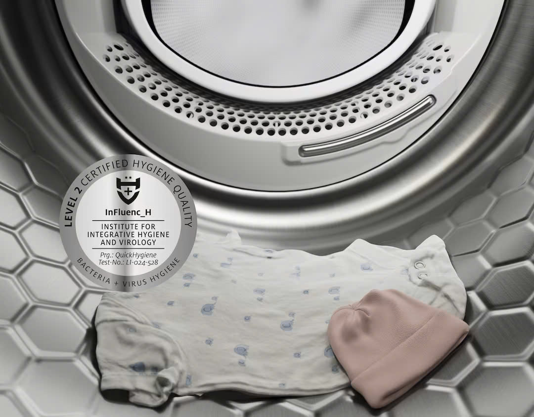 Trong chương trình QuickHygiene độc quyền của Miele, thời gian sấy khô được rút ngắn hơn một giờ. Chương trình này loại bỏ hơn 99,99% vi khuẩn và nấm mốc đã được thử nghiệm cũng như 99,9% vi-rút khỏi quần áo giặt của bạn. Mạt bụi và rệp giường cũng bị tiêu diệt đáng tin cậy. QuickHygiene thậm chí còn phù hợp với quần áo giặt khô có hai chấm trên nhãn chăm sóc.